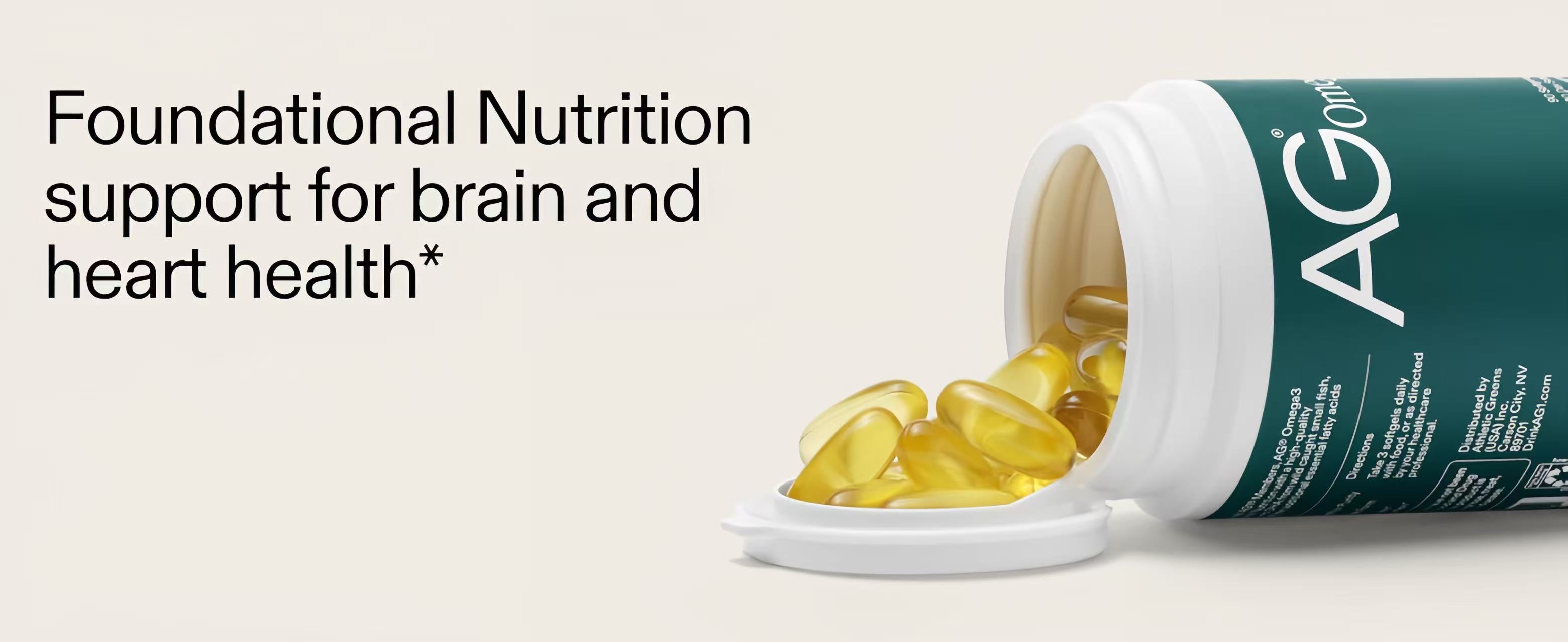 We formulate our AG Omega3 fish-oil soft gel supplements as a separate product from AG1 to ensure we're offering the highest-quality and most highly absorbable forms of EPA and DHA while keeping AG1 simple to use, water-soluble, and vegan.